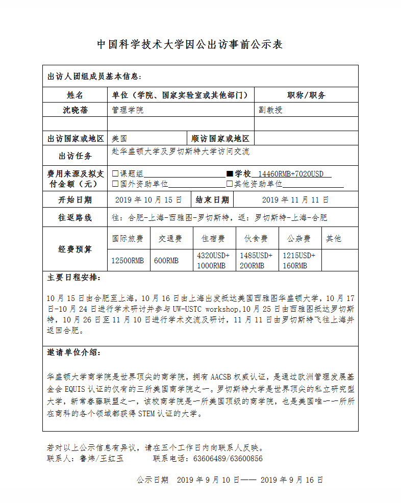 中國科學技術大學因公出訪事前公示表(沈曉蓓)