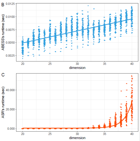 圖一 算法的計算時間隨著變量個數增加的散點圖。其中上圖是新提出的算法,下圖是經典的最優子集選取算法。