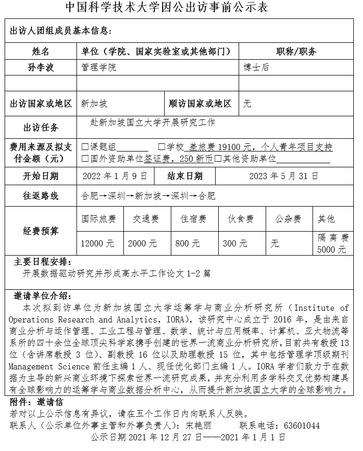 中國科學技術大學因公出訪事前公示表(孫李波)