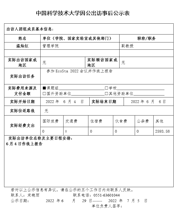 中國科學技術大學因公出訪事後公示表(溫燦紅)