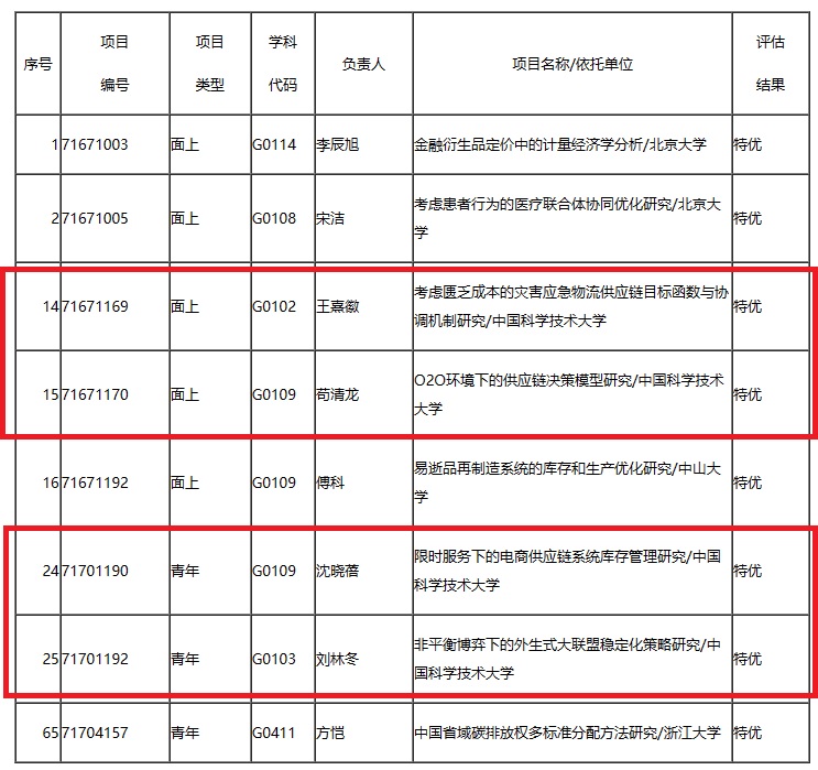 此次4個獲評“特優”的項目分別是:王熹徽教授主持的2016年度國家自然科學基金麵上項目《考慮匱乏成本的災害應急物流供應鏈目標函數與協調機製研究》、苟清龍教授主持的2016年度國家自然科學基金麵上項目《O2O環境下的供應鏈決策模型研究》、沈曉蓓教授主持的2017年度國家自然科學基金青年項目《限時服務下的電商供應鏈係統庫存管理研究》、劉林冬教授主持的2017年度國家自然科學基金青年項目《非平衡博弈下的外生式大聯盟穩定化策略研究》。