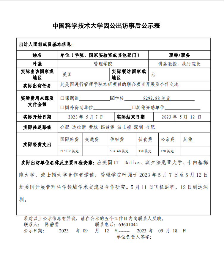 中國科學技術大學因公出訪事後公示表 (葉強)