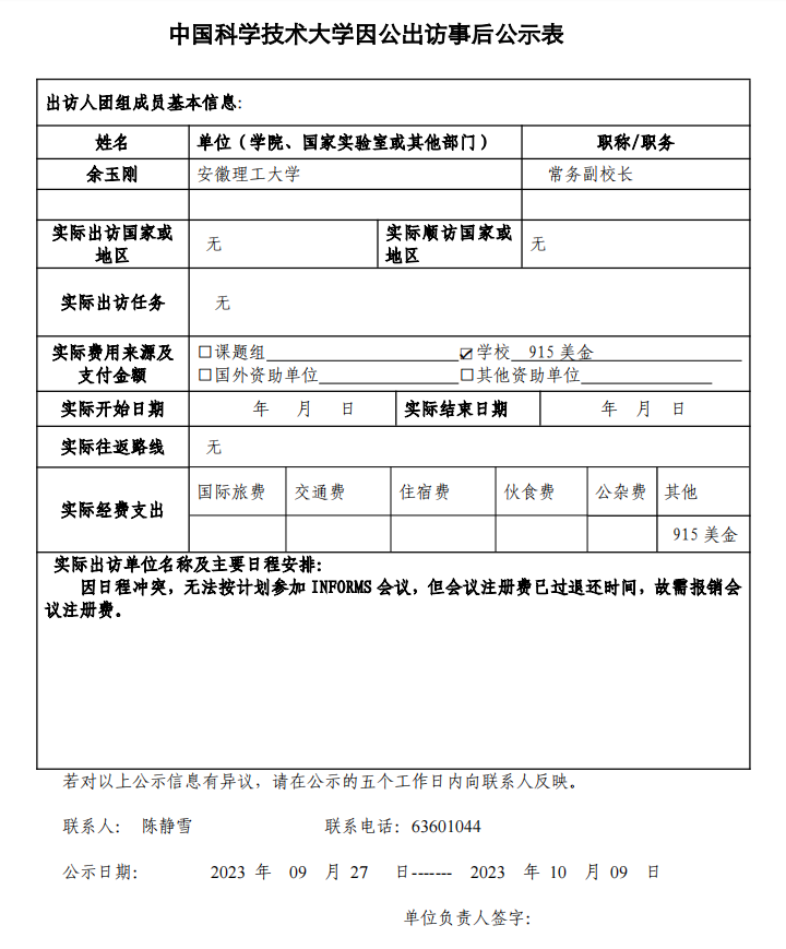 中國科學技術大學因公出訪事後公示表 (餘玉剛)