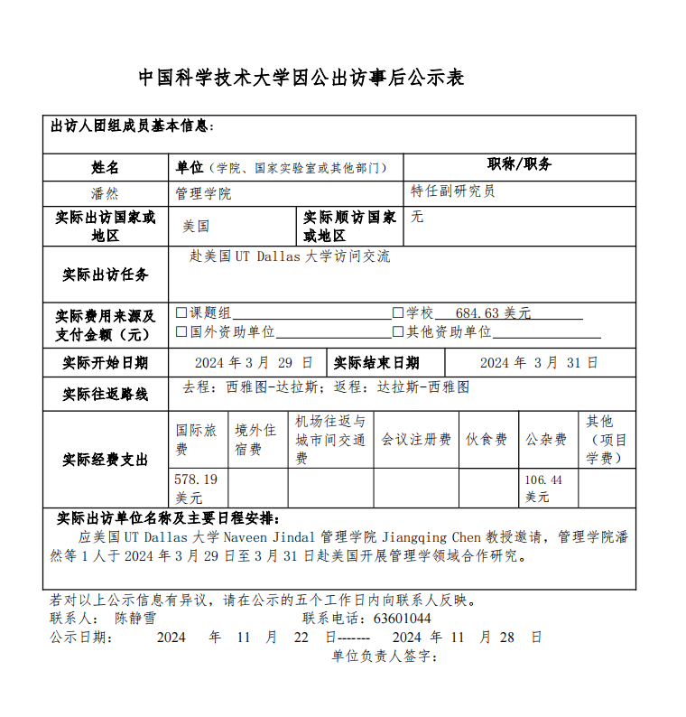 中國科學技術大學因公出訪事後公示表 (潘然)